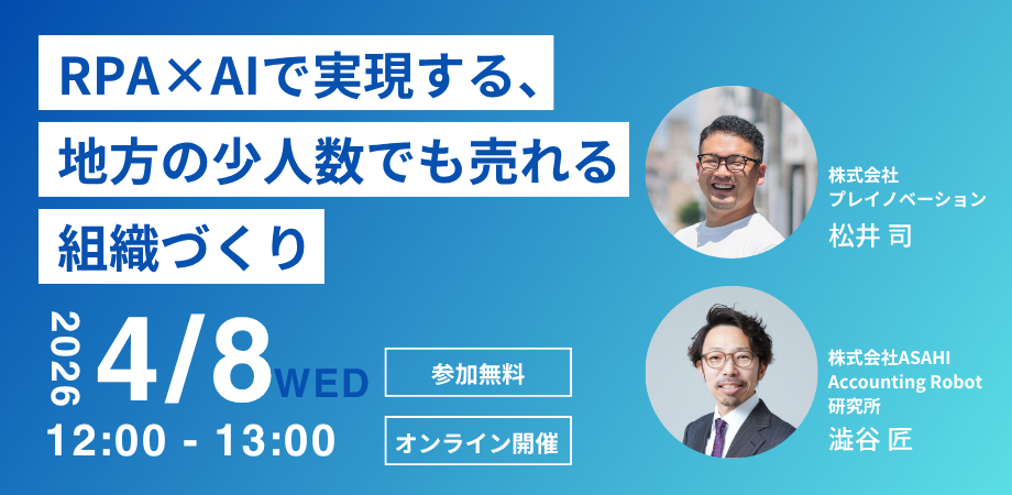 TOHOKU DX大賞2024ソリューション部門 優秀賞を受賞した株式会社プレイノベーションと、日本DX大賞2025支援部門 大賞を受賞した株式会社ASAHI Accounting Robot研究所が共同開催。両社が実際に取り組んできた「AI営業支援」と「RPA活用」の事例・デモを交えながら、東北の中小企業がすぐに使える業務自動化の第一歩をお届けします。 【セミナータイトル】 RPA×AIで実現する、地方の少人数でも売れる組織づくり ~業務自動化×AI営業支援で、東北の中小企業がスケールする仕組みをつくる~ ▼開催日時 2026年4月8日(水)12:00 ~ 13:00 ▼会場 オンライン(Zoom) ▼参加費 無料 ▼参加方法 お申し込みはこちら(外部サイト) ▼申込締切 2026年4月8日(水)12:00(定員に達し次第締め切ります) ▼注意事項 ご入室の際は、Zoom表示名をお申し込み時のお名前にご設定ください。 本イベントはライブ配信です。録音・録画はご遠慮ください。 Zoom未経験の方は、事前のアプリインストールと接続テストをおすすめします。 ▼こんな方におすすめ ・「AIやDXに興味はあるが何から始めればいいかわからない」経営者・営業責任者の方 ・少人数チームで売上を上げる仕組みを探している方 ・見積書・日報・フォローメールなどの手作業を減らしたい方 ・RPA・AIを導入した企業の生の事例・デモを見てみたい方 ▼タイムテーブル 12:00〜12:05 開会・趣旨説明 12:05〜12:20 AI活用による営業自動化の実践事例(株式会社プレイノベーション ) 12:20〜12:35 RPA導入で変わる業務現場〜受賞事例とデモ〜(ASAHI Accounting Robot研究所) 12:35〜12:55 ディスカッション・Q&A 12:55〜13:00 ご案内 ※内容・登壇順は当日の進行により変更になる場合があります。 ▼登壇者紹介 ・松井 司(株式会社プレイノベーション) TOHOKU DX大賞2024ソリューション部門 優秀賞受賞。生成AI・DX推進コンサルティングを通じ、東北の中小企業の営業現場へのAI活用を推進。 ・澁谷 匠 氏(株式会社ASAHI Accounting Robot研究所) 日本DX大賞2025支援部門 大賞受賞。RPAを活用した業務自動化の推進において、東北地方の中小企業を数多く支援。実際のRPAロボット作成から運用定着まで、現場目線での導入ノウハウを持つ。 ▼主催・共催 主催:株式会社プレイノベーション 生成AI・DX推進コンサルティング、AI勉強会・人材育成を軸に、東北の中小企業の成長を支援。TOHOKU DX大賞2024ソリューション部門 優秀賞受賞。 共催:株式会社ASAHI Accounting Robot研究所 RPA導入・業務自動化の推進を通じて、中小企業の生産性向上を支援。日本DX大賞2025支援部門 大賞受賞。